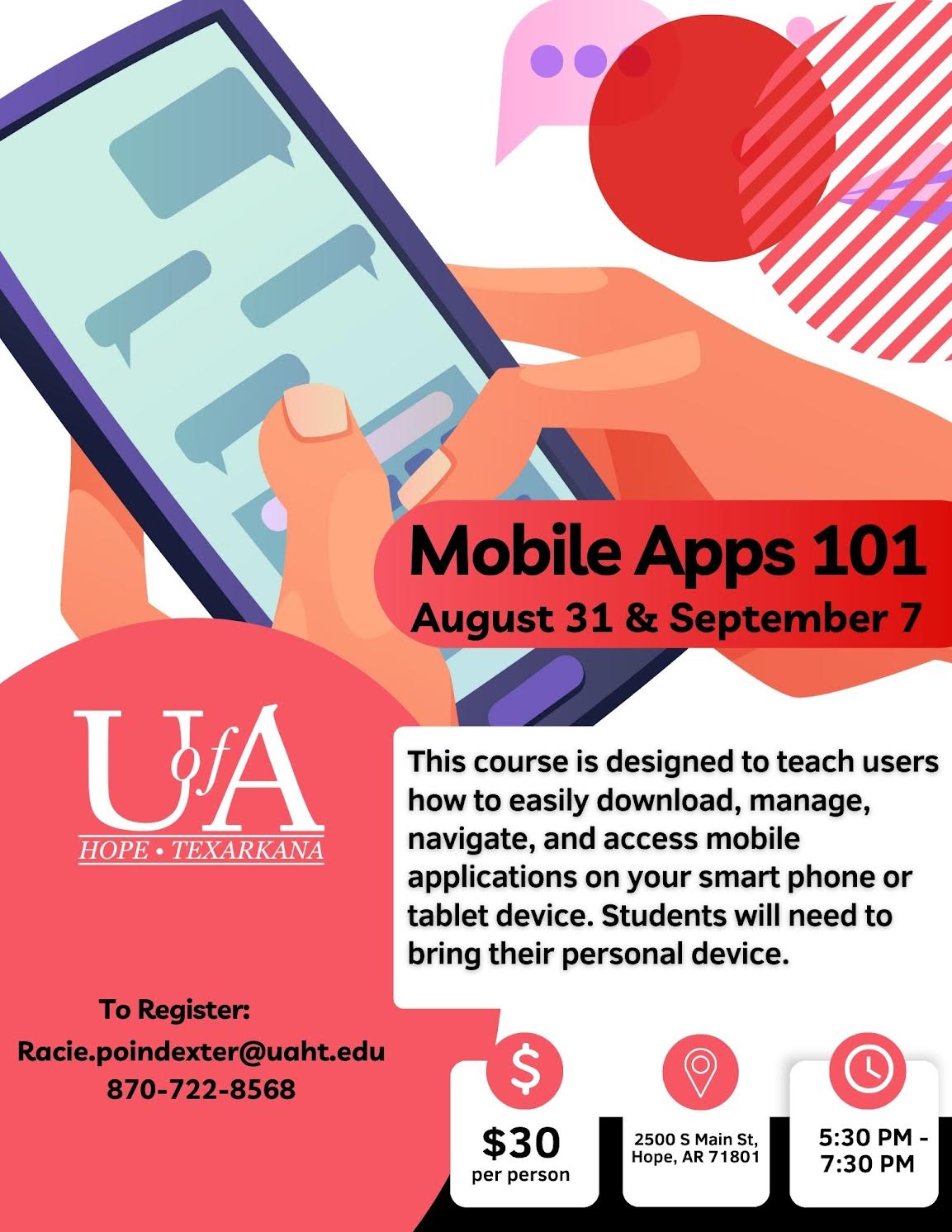 The University of Arkansas Hope-Texarkana is offering a Mobile Apps 101 course on August 31 and September 7 from 5:30 to 7:30 p.m. at Hempstead Hall on the Hope campus. The class will teach students to download, access, manage, navigate, and learn savvy tricks for apps on personal devices such as smartphones and tablets.
