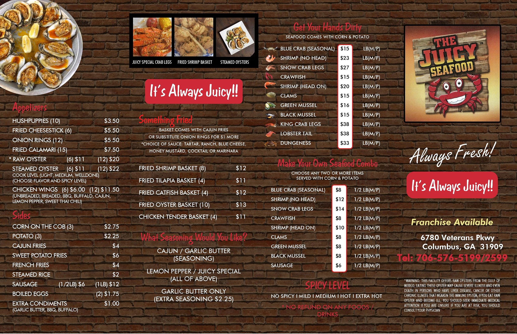 The Juicy Seafood serves fried seafood and shellfish combos, according to their menu. Offering seafood such as blue crab, shrimp, snow crab legs, crawfish, clams, and mussels.