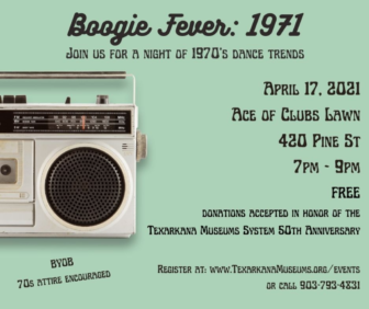 The Texarkana Museums System is hosting a 1970’s dance party on April 17, 2021, from 7pm to 9pm. We will be playing the hits and dancing the trends from the 1970s! We want YOU to join in the fun! Free admission but donations are appreciated. BYOB if you need a little liquid courage for the dance floor. The party will be hosted at the Ace of Clubs Lawn. Please register in advance, to register go to www.TexarkanaMuseums.org/