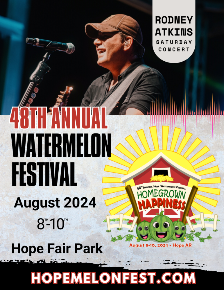 “We are thrilled to welcome Rodney Atkins to the 48th Annual Hope Watermelon Festival,” said festival organizer, Christy Burns. “His undeniable talent, combined with his genuine connection to his fans, makes him the perfect headliner for this year’s event. Get ready for an unforgettable night of music, laughter, and good old-fashioned fun!”