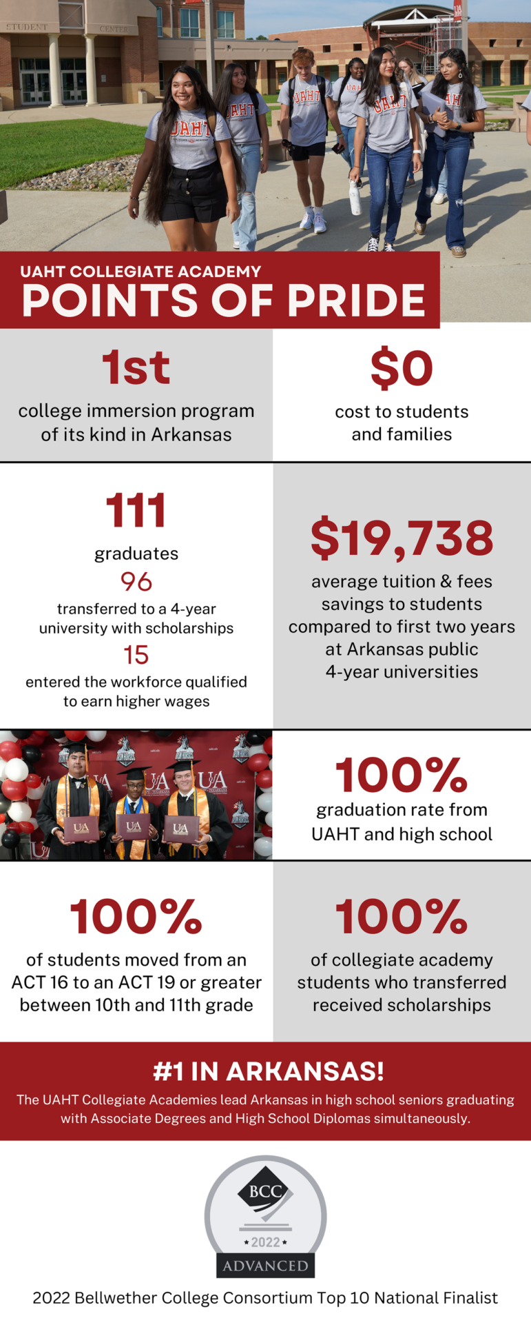 The Hope Collegiate Academy is a partnership between the Hope Public School District and the University of Arkansas Hope-Texarkana. The academy provides students with a three-year curriculum that allows them the opportunity to complete a high school diploma and an associate degree simultaneously. Since its inception, the collegiate academy has had a 100% graduation rate and saves students an average of $19,738 compared to the first two years at an Arkansas public four-year university.