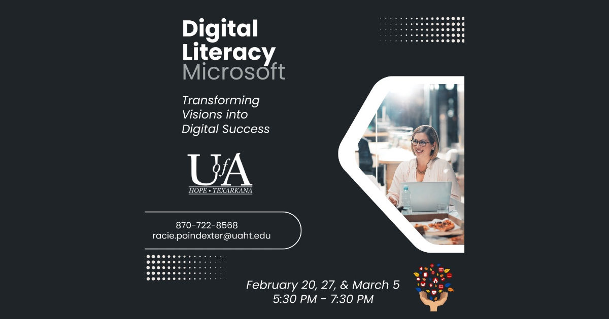 The University of Arkansas Hope-Texarkana will hold a beginner’s digital literacy course on February 20, 27, and March 5 at the UA Hope campus. Learn computer basics, including how peripherals (camera, mic, etc.) operate and basic file management. Students will also learn how to access information online and the ins and outs of communication, such as email, video chat, and instant messaging. This class is perfect for someone who wants to become a digital citizen but has little to no experience or knowledge.