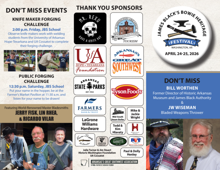 The City of Washington, Arkansas, in partnership with Buck’s Maintenance Service Inc., the University of Arkansas Hope-Texarkana Foundation, Arkansas’s Great Southwest, and Historic Washington State Park, will host the 5th Annual James Black’s Bowie Heritage Festival on April 24–25, 2026, from 9:00 a.m. to 5:00 p.m.