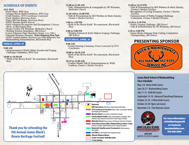 For more information, visit bowieknifefest.com, @VisitWashingtonAR on Facebook, or call 870-648-5084.