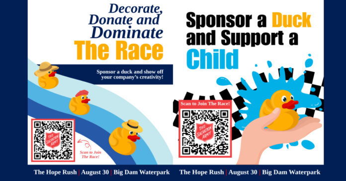 The Salvation Army Red Shield Youth Center is inviting the community to “waddle into the fun” at the 2025 Hope Rush Duck Derby, taking place August 30th at 3:00 PM at Big Dam Waterpark. The event will raise funds to provide after-school scholarships for children from the Center of Hope Homeless Shelter, giving them a safe space to learn, grow, and thrive.