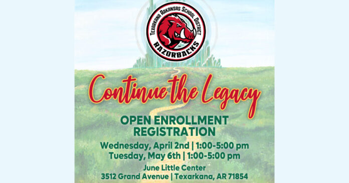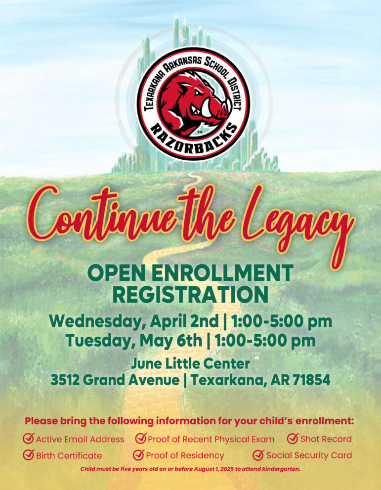The Texarkana Arkansas School District (TASD) will host Kindergarten Open Enrollment Registration events on Wednesday, April 2nd, and Tuesday, May 6th, from 1:00 to 5:00 PM.