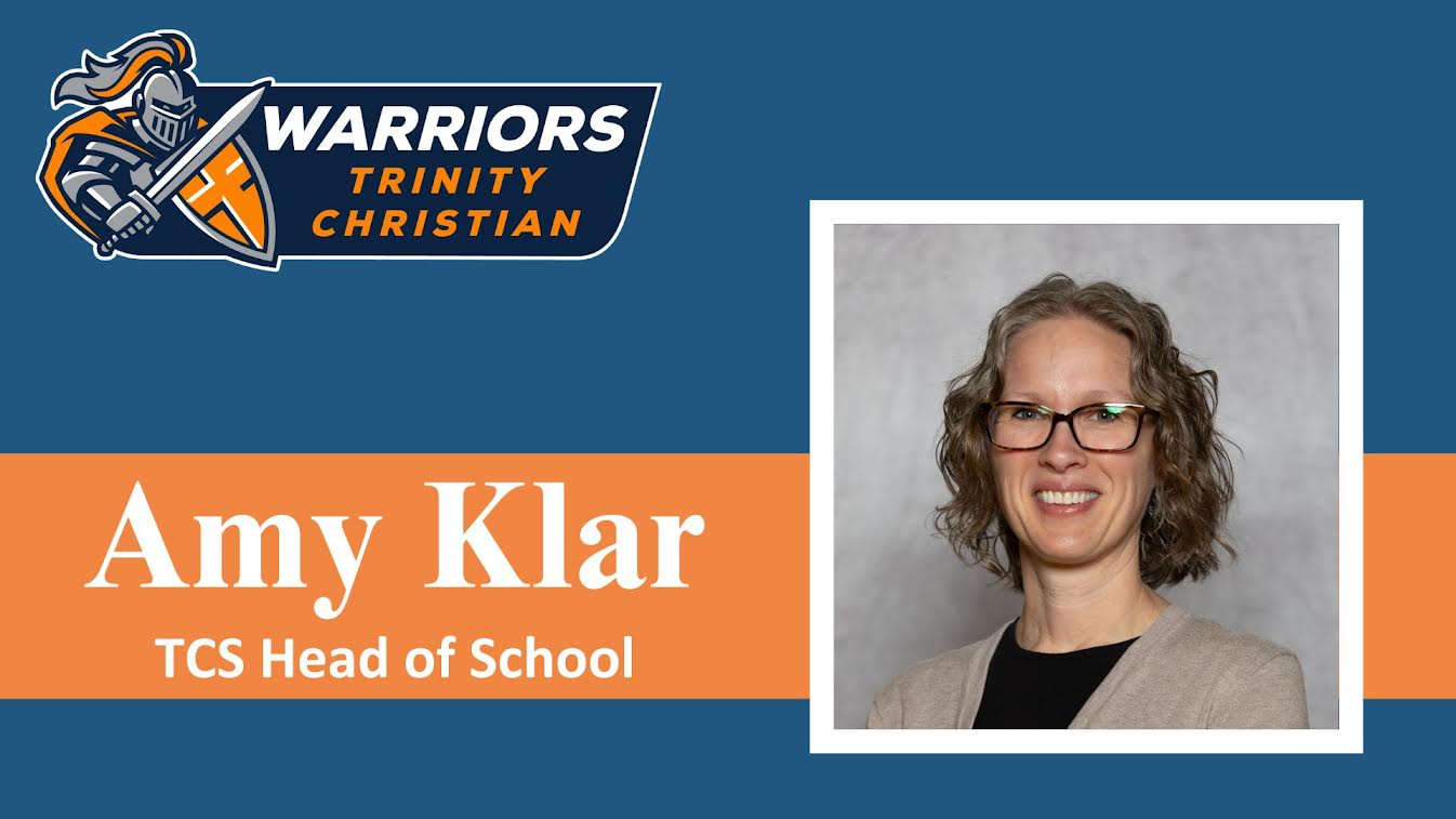 It is with great joy and gratitude to God that the Trinity Christian Schools Board of Directors announces the appointment of Mrs. Amy Klar as the next Head of School at TCS.