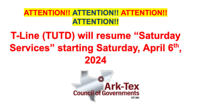 T-Line will resume “Saturday Services” starting this Saturday, April 6th, 2024, from 5:30 a.m. to 6:30 p.m. Texarkana Urban Transit District returns service after a four year pause.