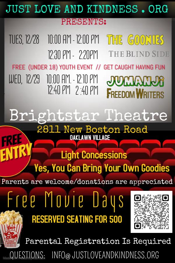 Just Love and Kindness is asking for volunteers for the event to help run concessions. If you are interested in volunteering send your information to info@justloveandkindess.org. Brightstar Theater is located at 2811 New Boston Road in the Oaklawn Village.