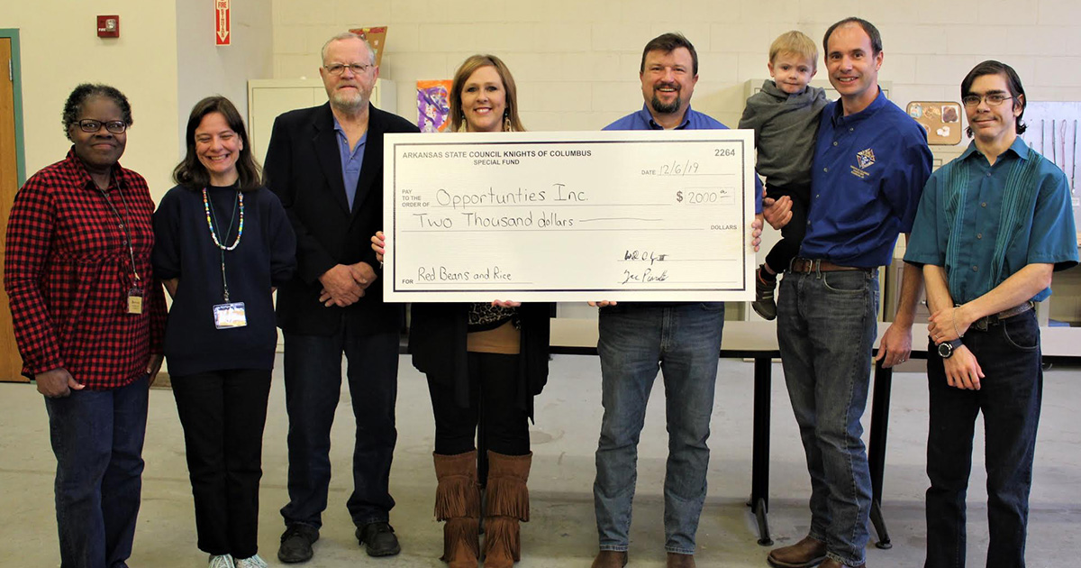 The Knights of Columbus Council 2650 presented a $2,000 check to Opportunities, Inc. Monies were raised from a Red Beans & Rice Dinner that is hosted annually in October at the Parish Hall of St. Edward’s Catholic Church. Their financial support will benefit children and adults with disabilities in our community.