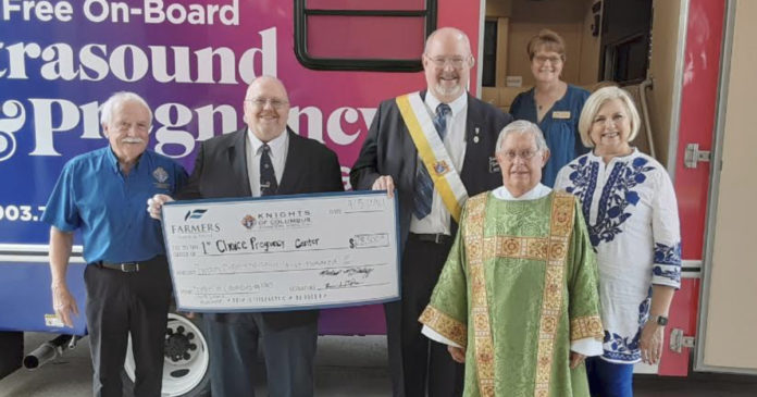 On Sunday, September 5, 2021, the Knights of Columbus Texarkana Council #1003 presented a check in the amount of $28,500 to 1st Choice Pregnancy Resource Center to help with expenses associated with their newly obtained mobile unit, “Leah”. This gift will allow the Center to purchase the ultrasound machine that they will use on the unit. Members of Sacred Heart Catholic church were able to tour “Leah” after services that same day. Mike McInturff, a member of the Knights of Columbus who was heavily involved with this project said, “The Knights are happy to help with this cause. We have, and always will, stand up for the unborn.”