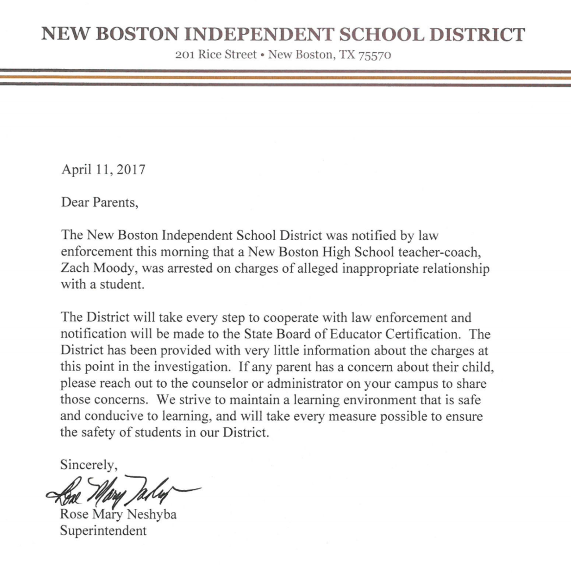 According to the letter the district is working with law enforcement and notification will be made to the State Board of Educator Certification.