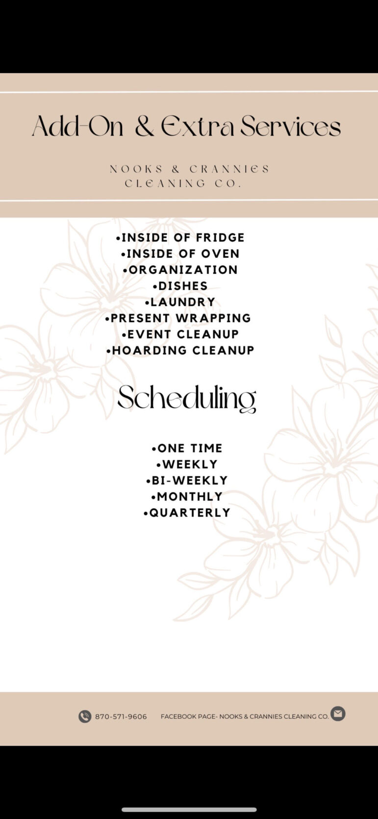 Nooks & Crannies offers extensive services for personal homes, apartments, and local businesses. “We offer pretty much any type of cleaning service for our clients, from hoarding clean-ups, move-ins, and outs to deep cleans and basic cleanings. We also offer a variety of other add-on services that can be found on our Facebook Page to ensure our clients have every need they could have met,” said Jaleigh.