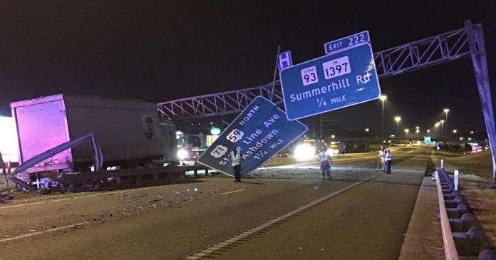 Both sides of I-30 were initially closed, and all traffic was diverted to Mall Drive and St. Michael Drive. Westbound was opened within an hour, but the eastbound lanes are still closed. TXDOT is on scene now working with the wrecker company to remove the road signage and the truck. There is no estimate on how long it will take to clear the road and reopen the Interstate.