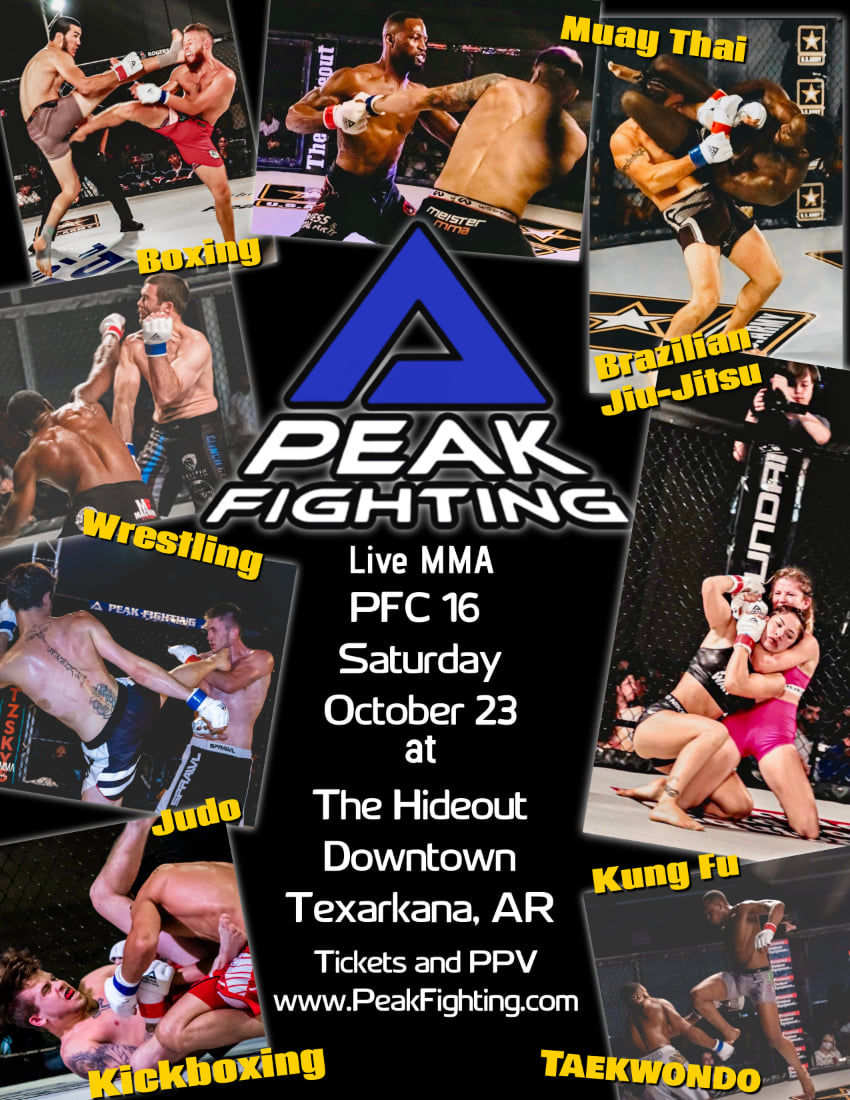 The Hideout is located at 311 E Broad Street, in Downtown Texarkana, Arkansas. Doors will open this Saturday starting at 4PM and fights will begin at 5PM. Tickets can be purchased beforehand on the Peak Fighting Website, or you can watch from home by purchasing the Pay-Per-View also available for purchase through the Peak Fighting Website.