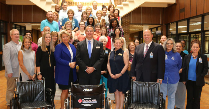At a ceremony held today, Texarkana Emergency Center donated three wheelchairs to Texarkana College for use on campus to temporarily aid students or guests who have limited mobility. The wheelchairs will be placed around campus in high-traffic areas and be available in case of emergencies or to assist those with injuries.