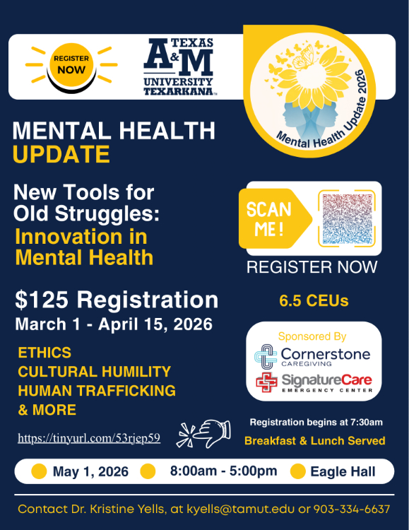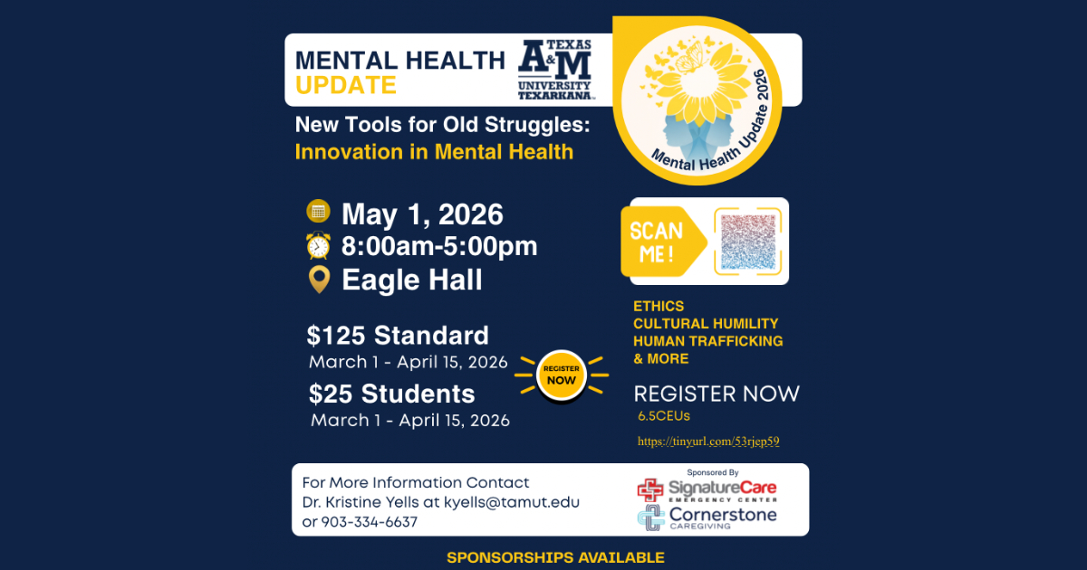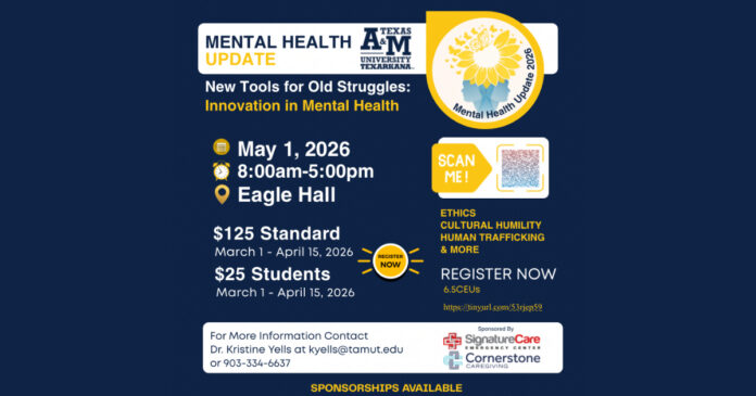 Mental health professionals from across the region will gather at Texas A&M University–Texarkana on Friday, May 1, for the 2026 Mental Health Update, a full‑day professional development conference focused on innovative tools, emerging practices, and critical issues in the field.