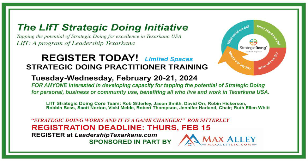 The February two-day training will be the fifth local training held in conjunction with the Agile Strategy Lab of the University of Northern Alabama, since April 2021, part of the Core Team’s goal of growing the capacity of leaders to effectively use Strategic tapping the potential of Strategic Doing for the benefit of Texarkana USA. To date, and to that end, ninety-eight community leaders have been trained. This year’s Strategic Doing Practitioner Trainings are being supported in part by MaxAlley Real Estate Development company and by all businesses and organizations which are investing in the training for their leaders.