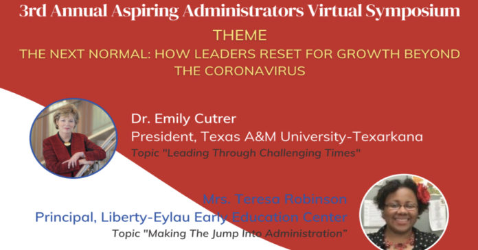The 3rd Annual Aspiring Administrators Virtual Symposium will be held this October 2nd. The theme this years is “The Next Normal: How Leaders Reset for Growth Beyond the Coronavirus.” The symposium this year will have several guest speakers from across the Texarkana area that include: Dr. Emily Cutrer (from Texas A&M University), Teresa Robinson (Principal from Liberty Eylau Early Education Center), Sherri Penix (TISD Chief Innovation Officer), and Dr. Cherry Ross Gooden (TABSE Higher Education Commission Chair).