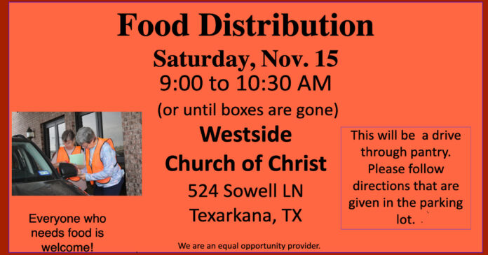 In a continued effort to support local families facing food insecurity, Westside Church of Christ will host a drive-through food distribution on Saturday, November 15, from 9:00 to 10:30 a.m. at 524 Sowell Lane, Texarkana, AR.