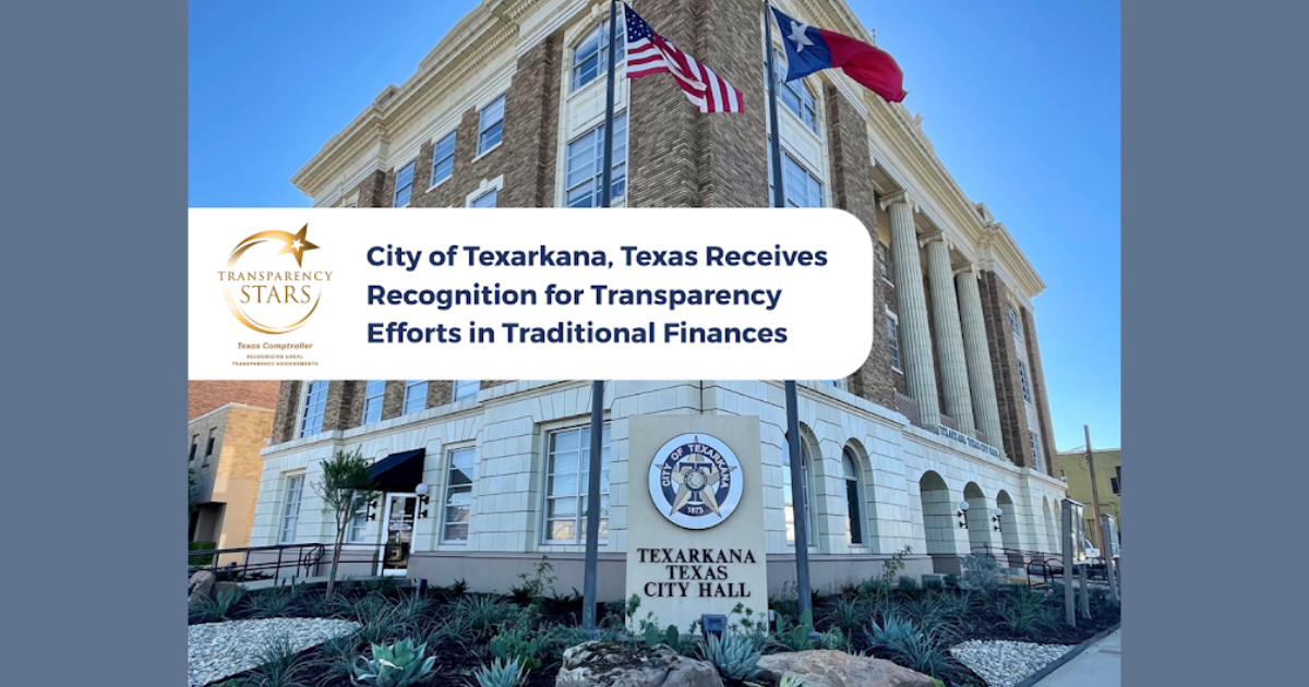 The City of Texarkana, Texas Finance Department has earned the Transparency Star for excellence in Traditional Finances, presented by Texas Comptroller Kelly Hancock.