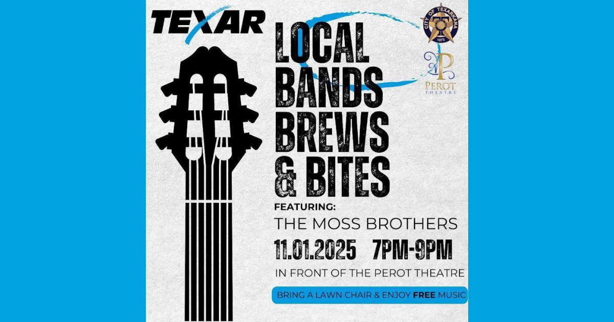 The City of Texarkana, Texas, in partnership with the Perot Theatre and TEXAR Federal Credit Union, invites residents to TEXAR’s Concert Series: Local Bands, Brews, and Bites on Saturday, November 1st, from 7:00–9:00 p.m..