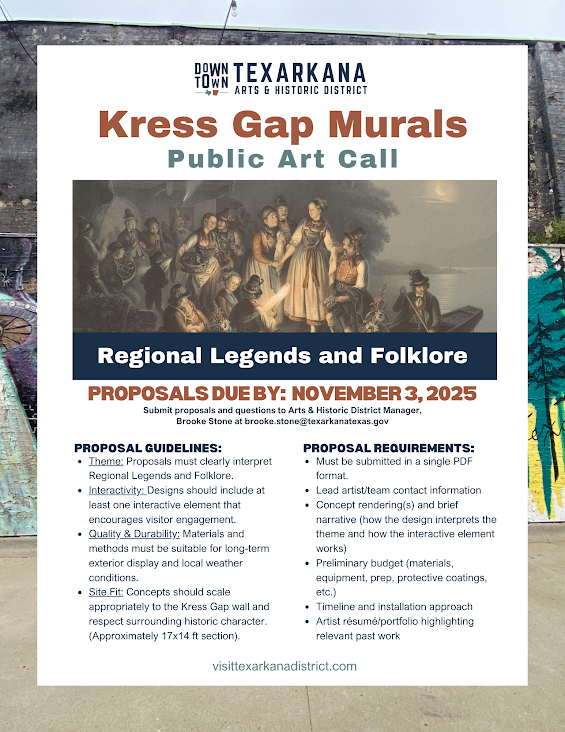 The Texarkana Arts & Historic District Committee has announced the community-selected theme for the next phase of murals at Kress Gap in downtown Texarkana: Regional Legends and Folklore. With the theme now set, the District has issued a call for proposals from local and regional artists to bring the concept to life on the restored Kress Gap wall.