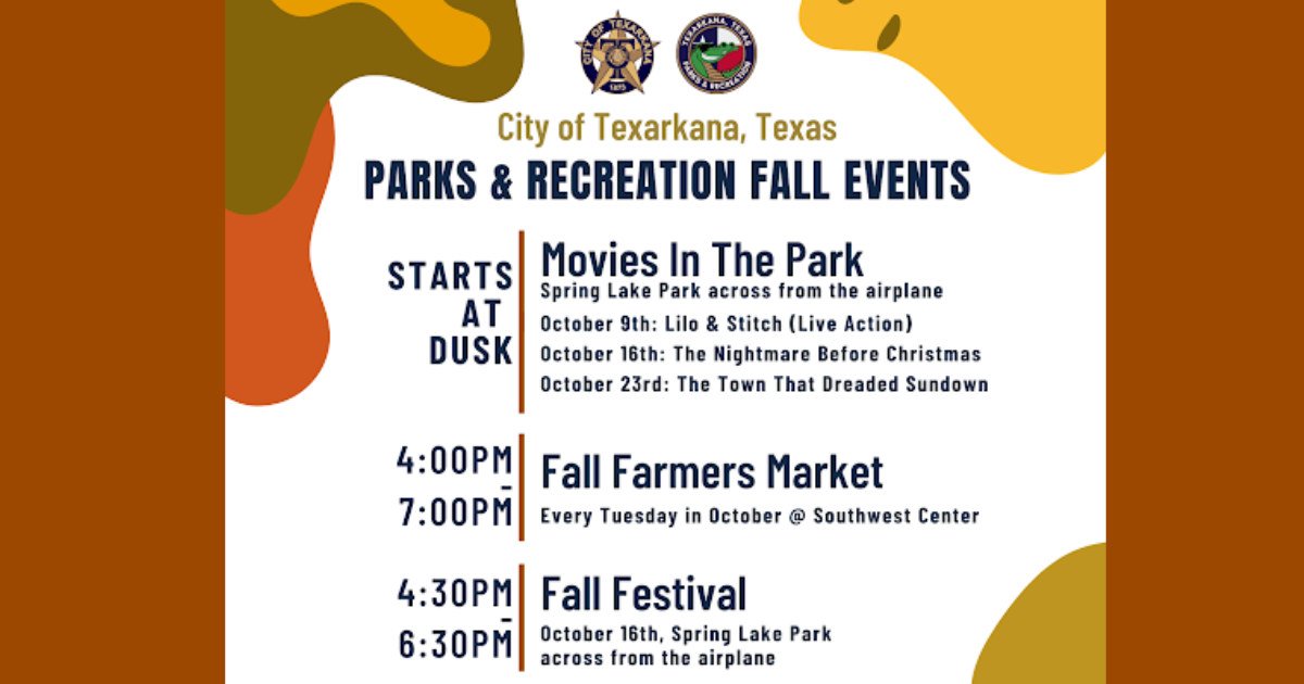 The Texarkana, Texas Parks and Recreation Department fall events begin Thursday, October 9, 2025. This year’s line-up includes farmers markets, movies nights under the stars, and fall festivals..