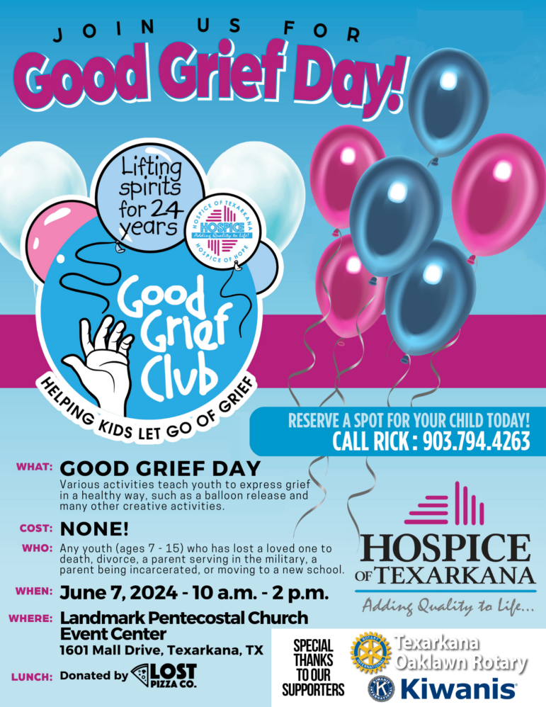 Hospice of Texarkana is hosting its 24th annual Good Grief Day, a grief camp for those who have experienced the loss of a loved one, on June 7, 2024, from 10:00 a.m.-2:00 p.m., at the Landmark Church Event Center (1601 Mall Drive, Texarkana, TX 75503). Hospice of Texarkana’s Good Grief Day endeavors to provide a sense of comfort and understanding during a difficult time in grieving children’s lives and allow them to connect with peers who are also experiencing grief.