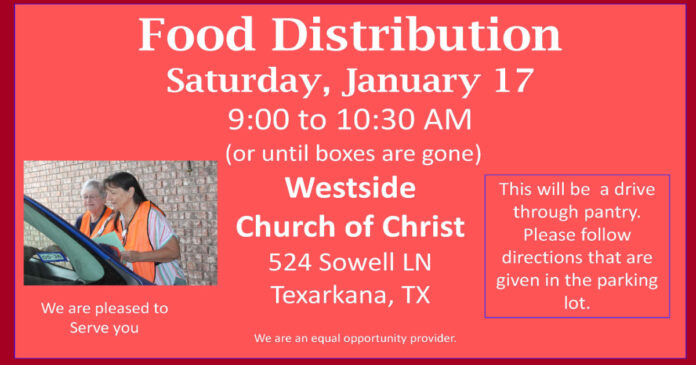 Westside Church of Christ will host a drive-through food distribution on Saturday, January 17, from 9:00 to 10:30 AM, or until supplies run out. The event will take place at the church’s location at 524 Sowell Lane in Texarkana, Texas.
