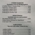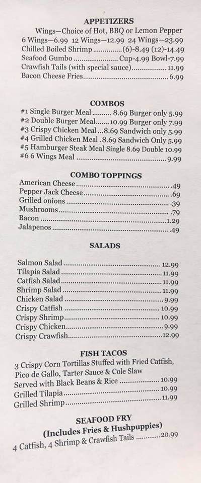 Entrées served at the Flying Burger include hamburgers, catfish, crawfish tails, salmon salad, fish tacos, broiled seafood platters, grilled plates and po’ boy sandwiches. Sides include coleslaw, fried green tomatoes, hushpuppies, fresh cut fries, corn on the cob, and grilled zucchini and squash.