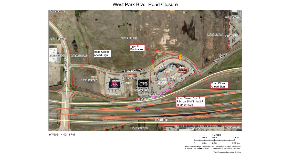 West Park Boulevard will be temporarily closed for 24 hours beginning at 2:00 p.m. on Tuesday, September 14, 2021 and will reopen at 2:00 p.m. on Wednesday, September 15, 2021.