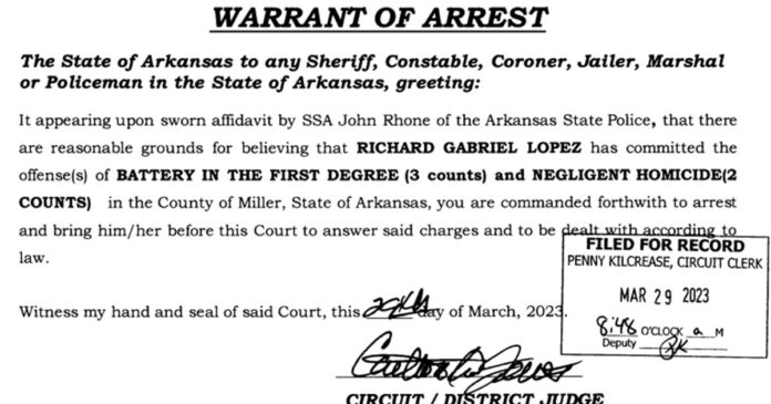 According to an affidavit for warrant filed by Arkansas State Police, the girlfriend of Lopez state she stopped at a the Flying J in Mandeville, Ark. for fuel when Lopez jumped into the driver seat and took off. At the scene Lopez refused to give his name. According to ASP Trooper Ryne Shelton, Lopez appeared to be impaired.