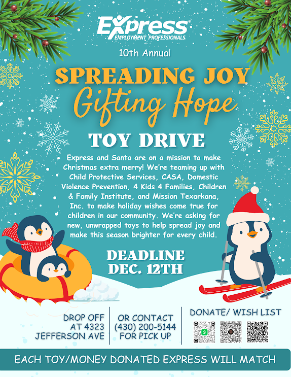 Express Employment Professionals is kicking off its 10th Annual Toy Drive, marking a decade of bringing holiday cheer to children throughout the Ark-La-Tex. Since the event began, the generosity of our community has helped us donate more than 15,000 toys to local kids in need.