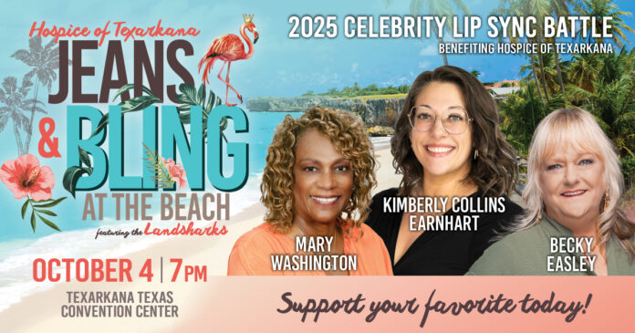 Hospice of Texarkana is excited to announce the 16th Annual Jeans & Bling fundraiser, returning this year with a tropical twist as Jeans & Bling @ the Beach! It will take place on Saturday, October 4, 2025, at 7:00 p.m. at the Texarkana, Texas Convention Center. This year’s presenting sponsors are CHRISTUS St. Michael Health Care System, along with our main media sponsor, KKYR, and Diamond Sponsors, Wholesale Electric Supply, the Yates Foundation, Higginbotham Insurance, the Cabe Cook Foundation, and Vee and Ron Collins. All proceeds support the area’s only freestanding hospice inpatient Care Center, serving patients and families within a 75-mile radius.
