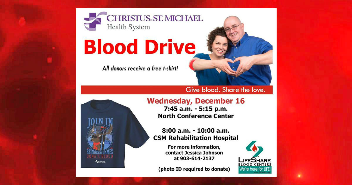Come #GiveBlood today, Dec. 16 in the CHRISTUS St. Michael North Conference Room until 5:15 p.m. or at the CHRISTUS St. Michael Rehabilitation Hospital until 10 a.m. today. All donors receive a free t-shirt!