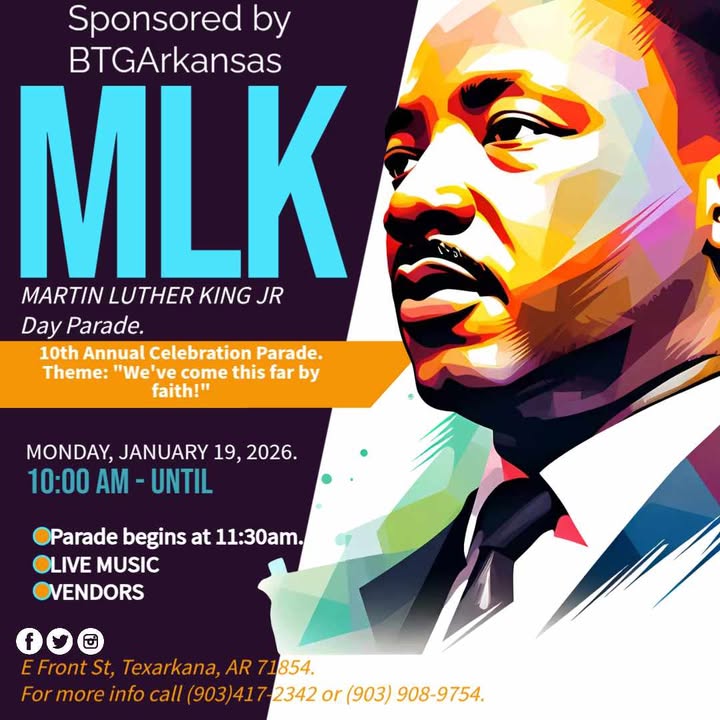 Sponsored by BTGArkansas, the 10th Annual Martin Luther King Jr. Day Parade will take place on Monday, Jan. 19, 2026, along East Front Street in Texarkana, Arkansas. This year’s milestone celebration is organized around the theme: “We’ve come this far by faith!”