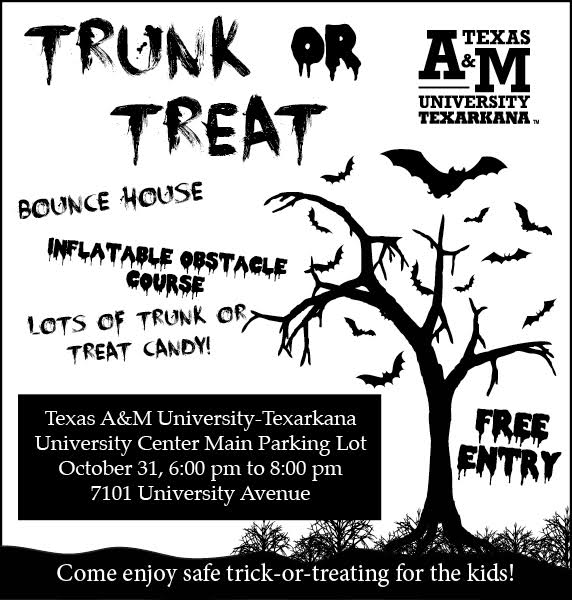 Texas A&M University-Texarkana will host its annual Halloween Trunk or Treat celebration Saturday, Oct. 31, from 6-8 p.m. in the University Center main parking lot on the A&M-Texarkana campus at 7101 University Avenue, Texarkana, Texas.