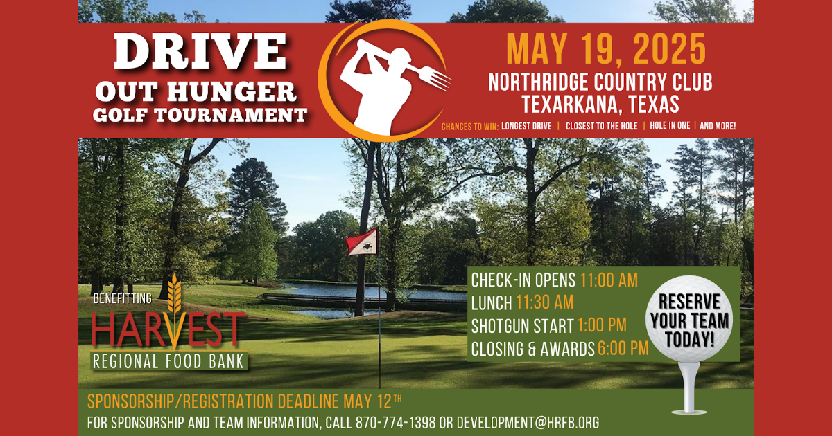 Harvest Regional Food Bank will host its annual Drive Out Hunger Golf Tournament, Monday, May 19th at Northridge Country Club in Texarkana. Participants will enjoy a day of fun on the green to help fight food insecurity in southwest Arkansas and northeast Texas. All the proceeds from this event support hunger relief programs at Harvest Regional Food Bank.