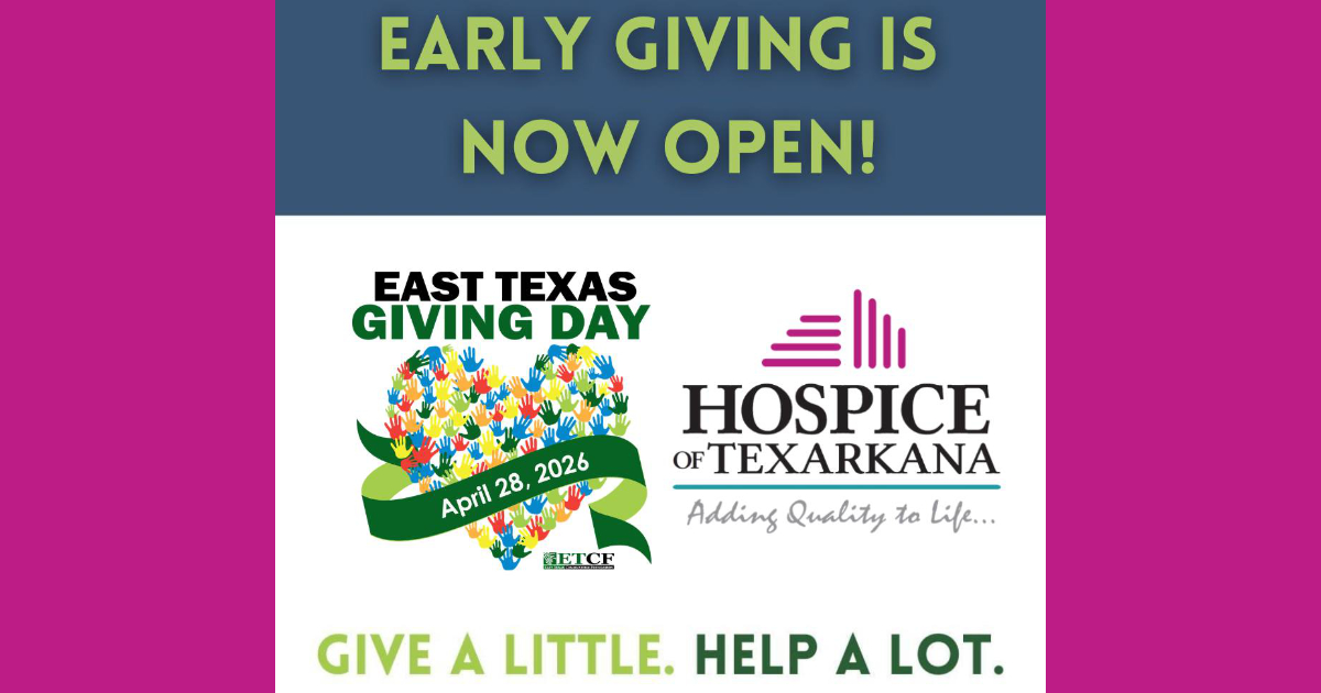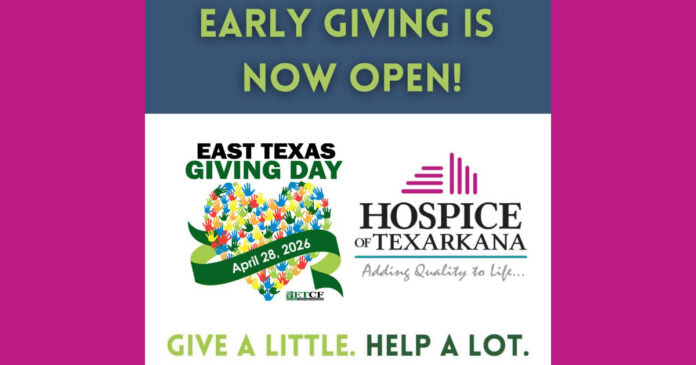 Hospice of Texarkana will participate in East Texas Giving Day from 6 a.m. to midnight on Tuesday, April 28. This one-day community-wide event gives donors an opportunity to double their donation thanks to a generous anonymous donor who has committed to matching every gift dollar-for-dollar, up to $10,000.