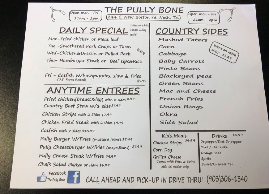 The Pully Bone is located at 240 New Boston Rd. in Nash, Texas and is locally owned and operated.