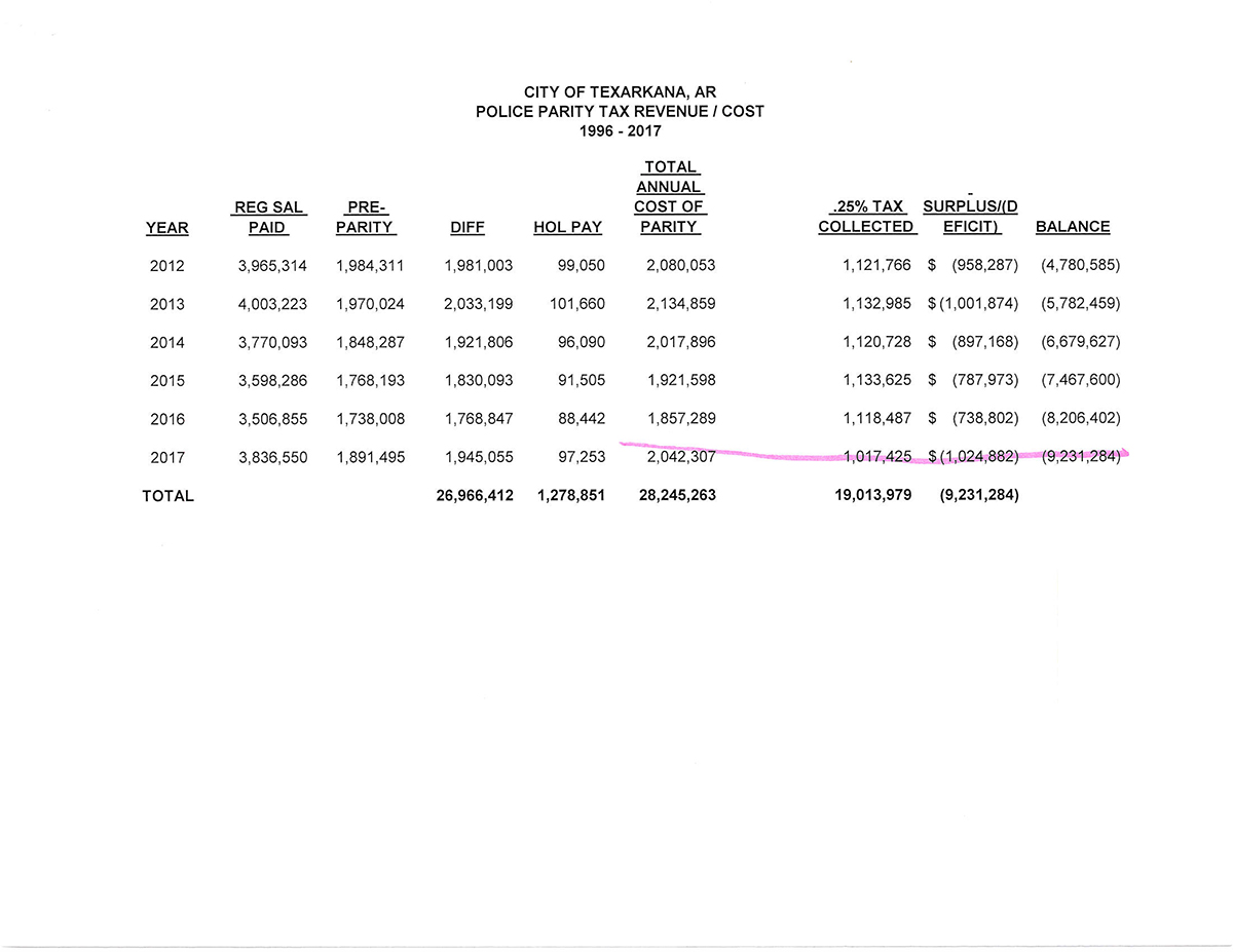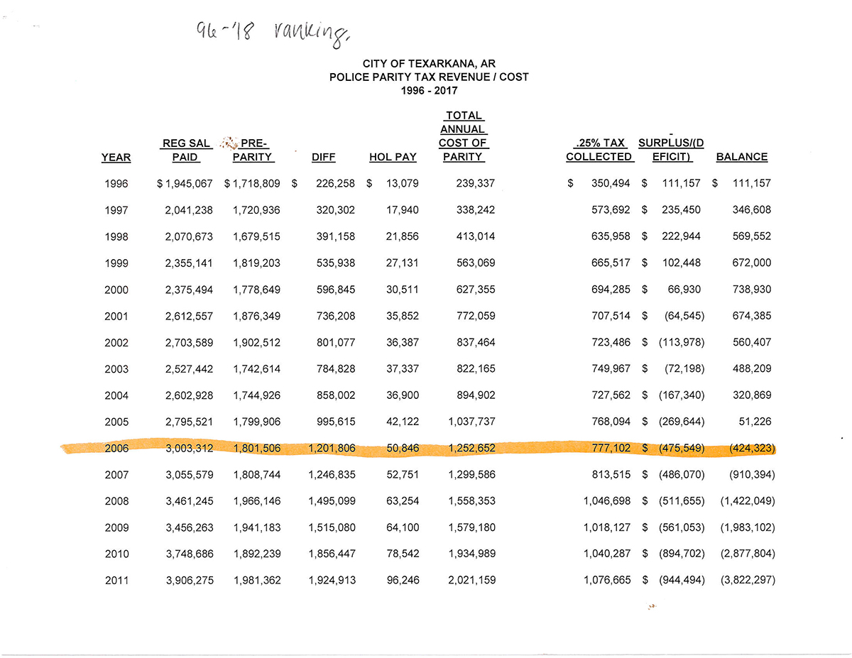 This isn’t the first time police parity has been evaluated. In 2004, City Manager, Charles Nickerson wrote an extensive letter to the Mayor and City Board of Texarkana, Arkansas. His letter outlines the imminent financial crisis that the City could find itself in.