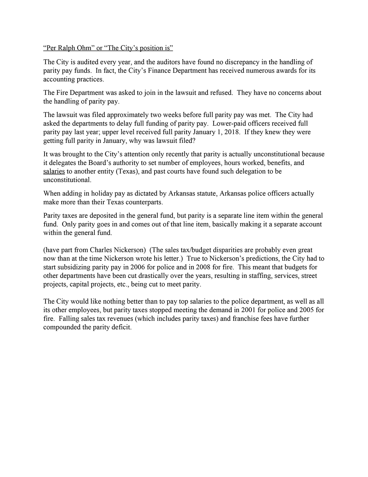 Ohm states, “the City is audited every year, and the auditors have found no discrepancy in the handling of parity pay funds. He continued, “the City would like nothing better than to pay top salaries to the police department, as well as all its other employees, but parity taxes stopped meeting the demand in 2001 for police and 2005 for fire.”