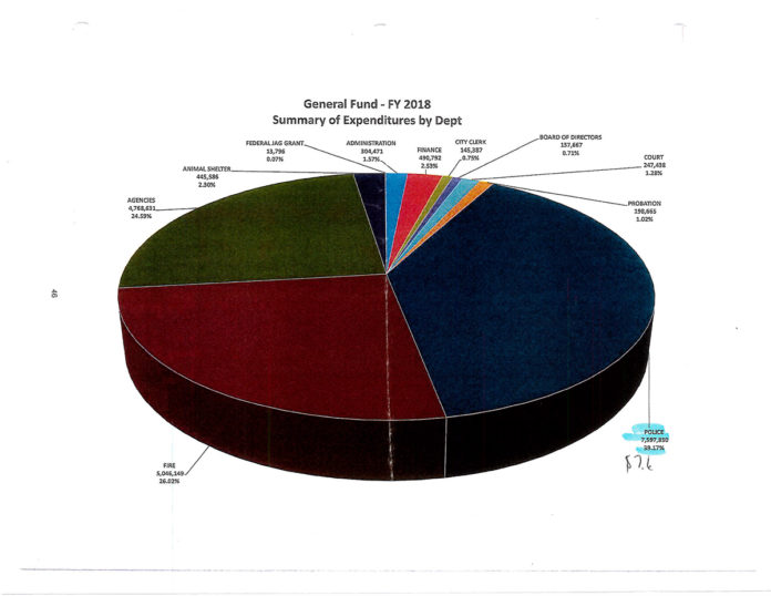 The General Fund is suffering, with only $19,396,431 in revenues budgeted, their expenditures are equivalent. The Police Department currently accounts for 39% of the entire General Budget. In 1996 the police department accounted for $3,220,300; today, it accounts for $7.6 million, a $4,377,550 increase in budget over the last 20 years.