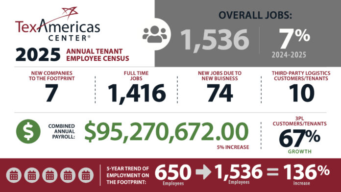 TexAmericas Center, which owns and operates the 5th-ranked industrial park and is one of the largest mixed-use industrial parks in the United States, today announced strong year-over-year gains in employment, payroll, and third-party logistics activity, according to its 2025 Annual Tenant Employment and Payroll Census.