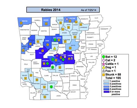 Of the 105 total cases reported in Arkansas 88 were skunks, one fox, one dog, one cow, two cats, and 12 bats.