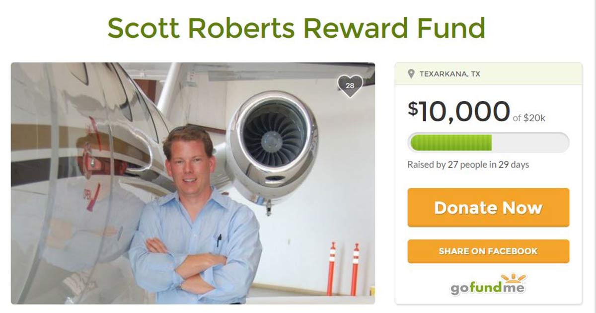 Using the online source, “Go Fund Me”, the family of Scott Roberts has raised a $10,000 dollar cash reward to anyone who provides information that assists Texarkana, Arkansas Police in apprehending the murder suspect.