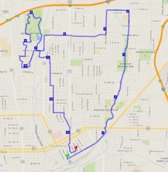 This 13.1-mile race starts at Broad and Main Streets in downtown Texarkana, TX and finishes in Texarkana, AR in front of Hopkins Ice House at 3rd and Wood Streets. The course includes two park asphalt trails and residential neighborhoods on city streets.