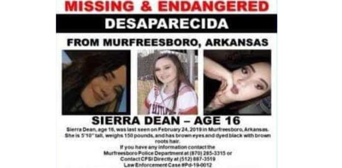 Authorities are asking for help in locating Sierra Dean a 16-year-old female reported missing on February 24, 2019 from Murfreesboro, Ark.