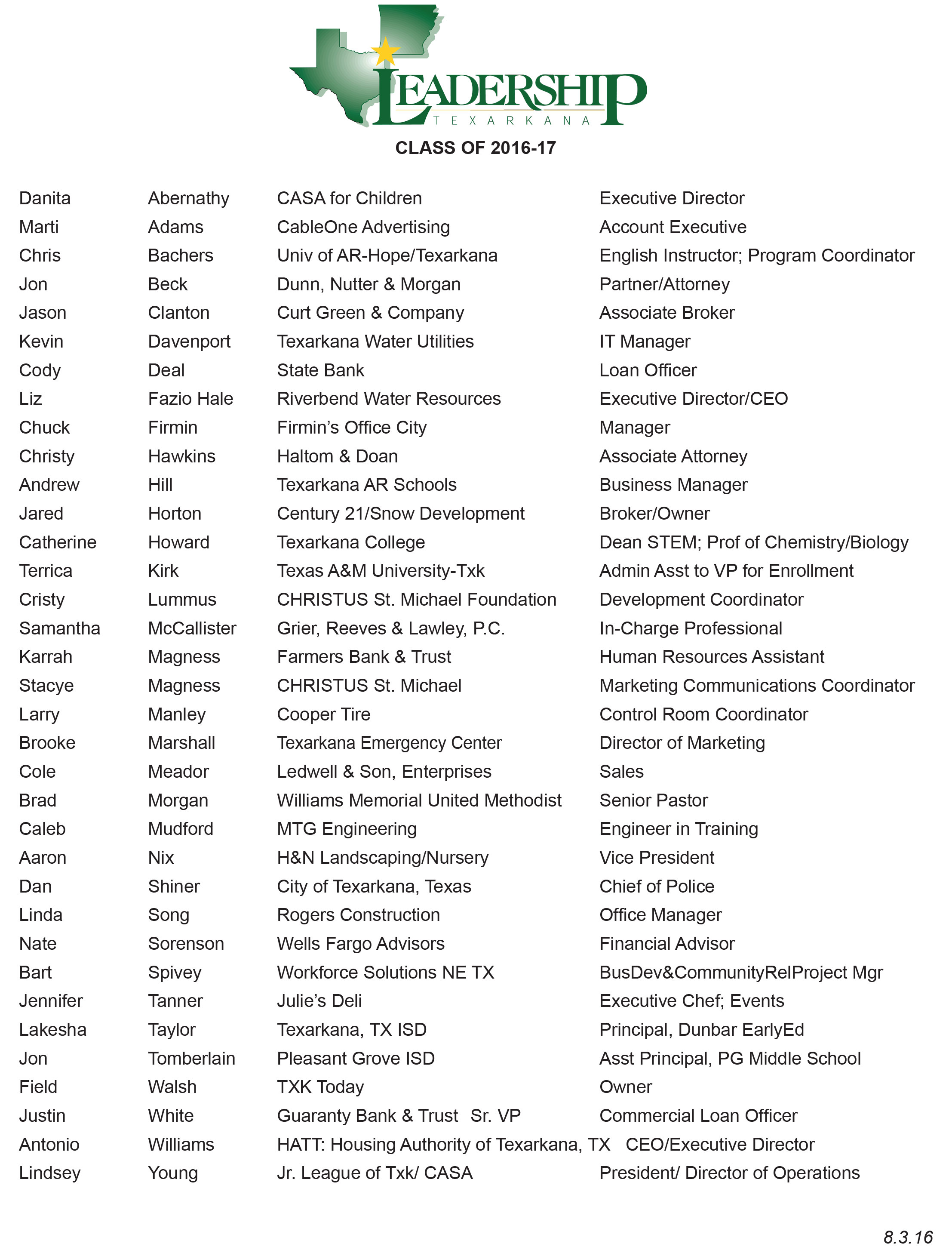 Go to LeadershipTexarkana.com for additional information about the organization.